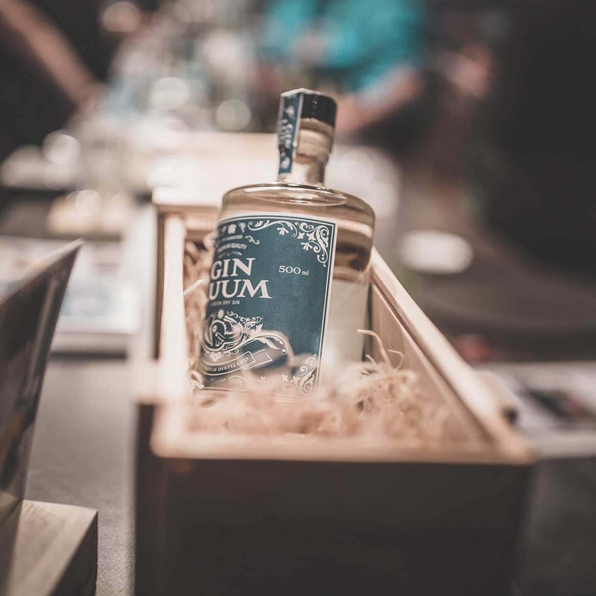 Premium London Dry Gin 500 ml auf Holzwolle in gebrandetem Woodcase.
